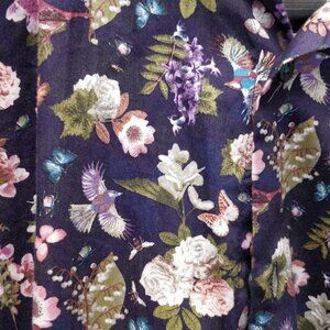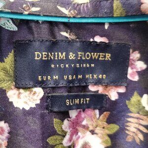 Floral and birds patterned button down by DENIM & FLOWER. Slim fitting medium. Navy with teal contrast stitched buttons. 100% cotton.