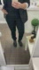 Black with cream coloured side stripes that give slumming illusion. Stretch fabric that look dressy but feel like sweats. Zipper, no pockets, flat front, slim/skinny cut close to body. GUC