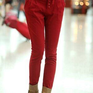 Slim-leg pants. Visible buttoning, belt loops, slit pockets on sides. Front pleats. Wide back zipper. * Belt not included. Brand : Unknown. Fabric: Mixed polyester. Color : Red. Size : 8.