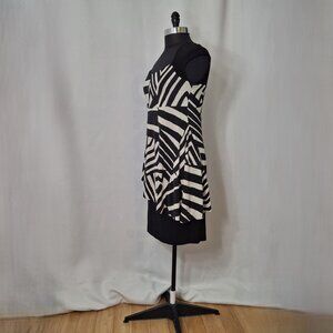 Slimming Simon Chang Black Beige Asymmetrical Peplum Tiered DRESS Size Stretchy Medium