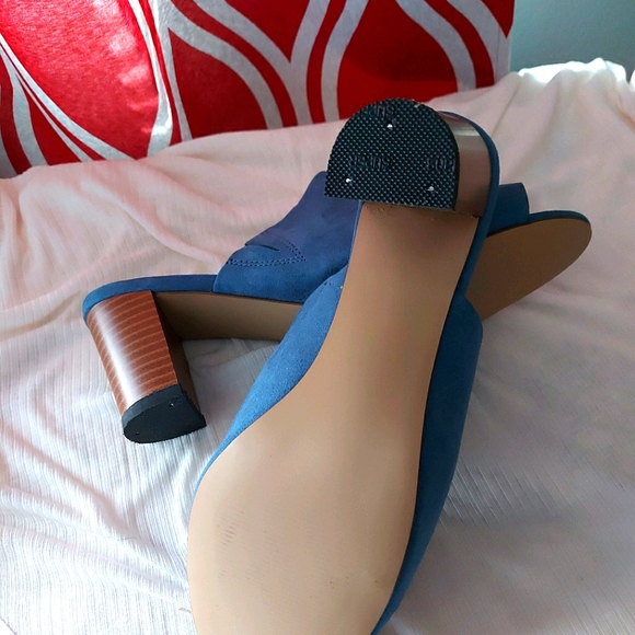 Teal colored 2 inch block heel slip ons.
