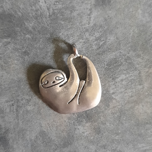 Silver plated sloth pendant, the plating on the back has worn off a bit from wear, visible in 2nd pic! Measures approx 1"×1"