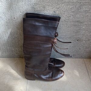 Posting these for my sister. I wish they fit me so I could keep them but they are 1/2 size too small. These are a size 38. Previously worn by her. They have some scuffs on the toes pictured to account for in price. Just so buyer is clear; the lower half (up to the seam where the knot is) is full leather. The upper bit is a matching lined material. See pictures and don’t hesitate to ask if you have questions.