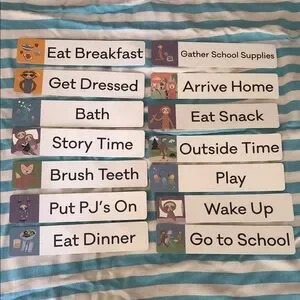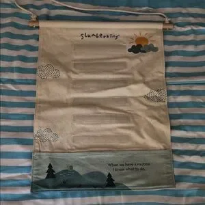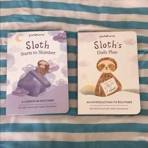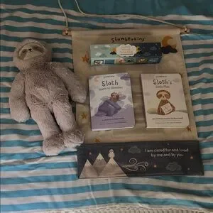 Set comes with sloth plush, 2 board books, and hanging schedule with activity cards.