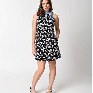 The bold, graphic pattern features an array of adorable hairstyles in a collage-like, overlapping fashion. Stylish mod silhouette floats out in an A-line shape and the dress is topped off with a blue tie that bows around the neck, adding a playful and feminine allure. Also features two fully functional pockets!