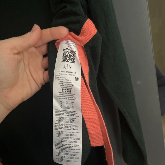 Virgin wool dark green and pink accent sweater. This item is very unique colour. In dark spaces it appears black or almost navy, but in bright natural light looks to be a deep green colour. With pink accents along the seams and deep slits along the sides.
