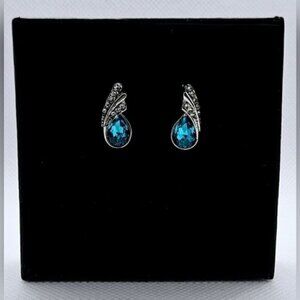 Small Azure Blue, Clear Crystal Teardrop Stud Earrings Silver Plated