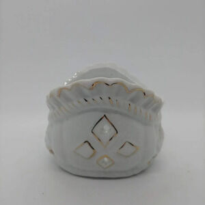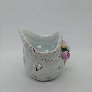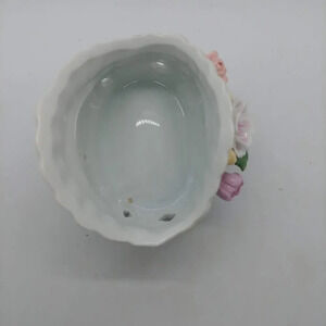 Symmetrical design where the front is lower than the back. Diamond cutouts and metallic gold coloured details. Realistic ceramic 3D flower, leaves and bow on front of bowl.