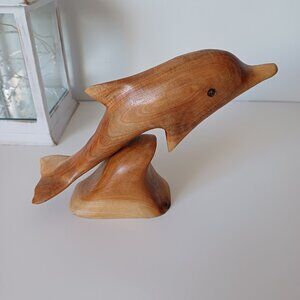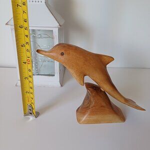 Beautiful carved light brown wood dolphin on wooden base. Height: approx. 5'', please see pictures for dimensions. Very good condition