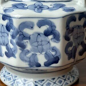 Description ๐๐ค Small Chinese teapot, white and blue ceramics. Stylized flowers are painted on eight segments around the circumference of the teapot. The leg of the teapot is decorated with a pattern of rhombuses. Flowers and plant ornament on the handle and lid of the teapot.