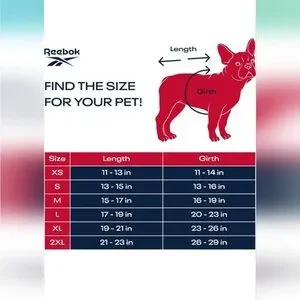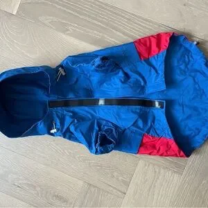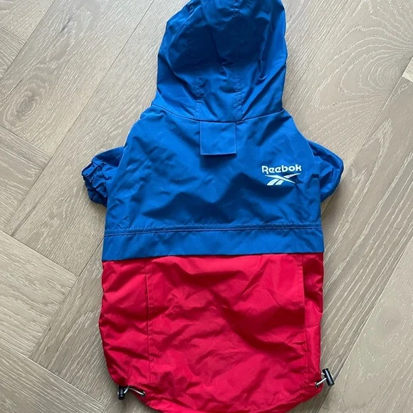 Super cute blue and red Reebok dog windbreaker with hoodie pocket and a hole for a leash.