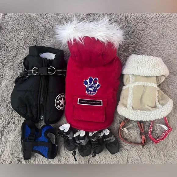 Accessories lot for xsmall/small dog. Would fit dog smaller than 9lbs. All in great condition and barely worn. Canada pooch parka is size 10, refer to size chart