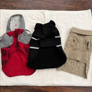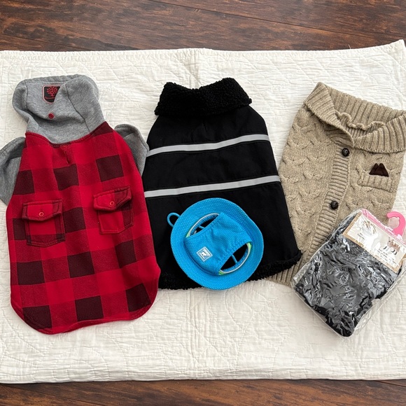 Lot of small dog sweaters, boots and hat…… these all fit my Bison/Mini Poodle mix, about 30 lbs max…. All have been worn but still in great shape
