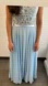 This elegant blue dress features a delicate lace bodice and a flowing skirt, perfect for any special occasion. The soft blue color adds a touch of sophistication and charm.
