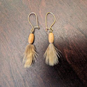 Gold shepherd's hooks, tan wooden beads, tan feather. Approx. 1.5" including the hooks, 1" for the bead and feather part.