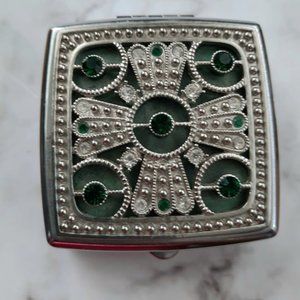 Green and silver rhinestone jewelry box with a plastic divider inside