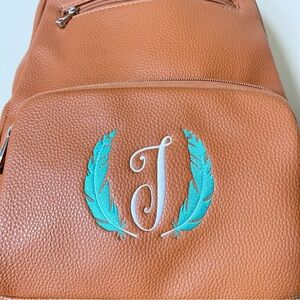 Perfect condition, adorable small pebbled leather-like backpack with embroidered J. Two exterior zippered pockets and one interior zipper pocket.