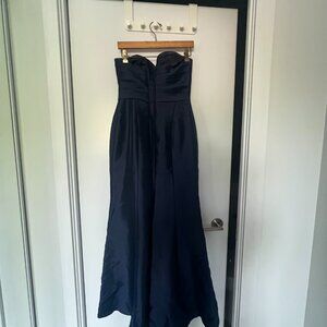 Elegant navy strapless bridesmaid dress with a structured sweetheart neckline and pleated waist detail. Features a subtle mermaid tail silhouette with a longer back hem – approx. 48.5 cm from waist to hem at the back, and 41 cm at the front. Zipper closure at the back. Worn once and in excellent condition.