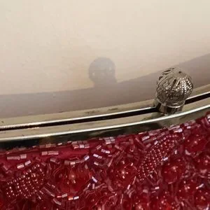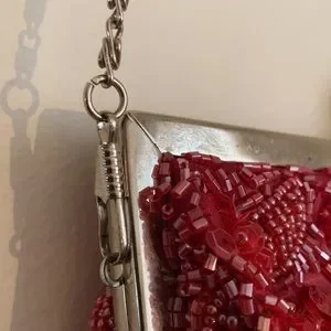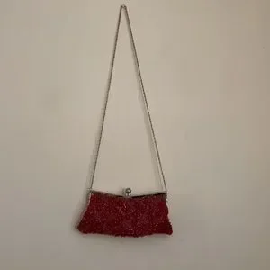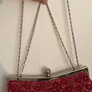 Small red beaded bag with two silver chains and clasp, small pocket on inside, red lining to the bag, snap clasp, red flower beads, 9/10 condition, small scratches on the top of the silver but not noticeable once wearing the bag, great for a night out, perfect to fit phone key and wallet.