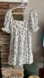White/ivory color with blue and green floral print. Whimsical feel to it.