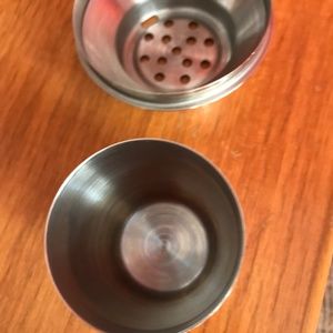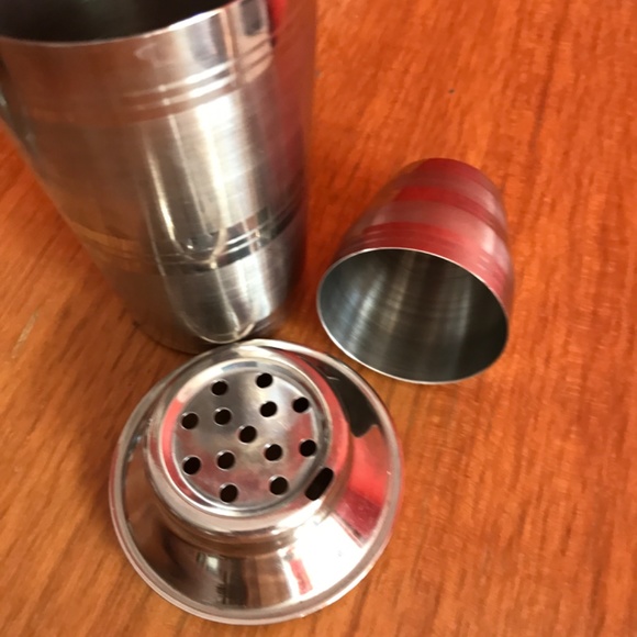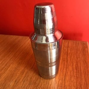 Fancy a Cosmo? This stylish stainless steal martini shaker is perfect for cocktail hour. Etched in a deco stripe pattern, this shaker holds about 12 OZ of liquid…with a little room. Comes with its own measure/lid and screen. In excellent used condition.