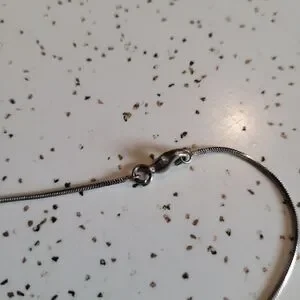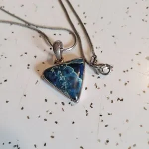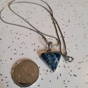 Smaller triangle stone pendant. Unsure of the type of stone. Quarter included for size. Pendant is stamped 925 on the inside of the bail- cannot get a clear photo. Chain appears to have sterling stamped tiny on the clasp however one of the connector rings has been overtighted- indicated in the last photo. Condition reflected in the price.