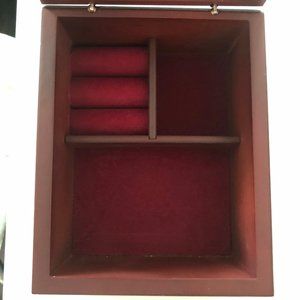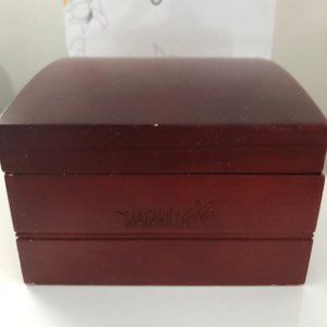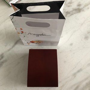Small Wood Magnolia Mirrored Jewelry Box. Measures: 4.75 " wide by 6.25 " long by 3.25 " high. It has a little tiny mark on the top of it, as shown, in the last pic but hardly visible otherwise in very good condition. Includes the Magnolia bag.