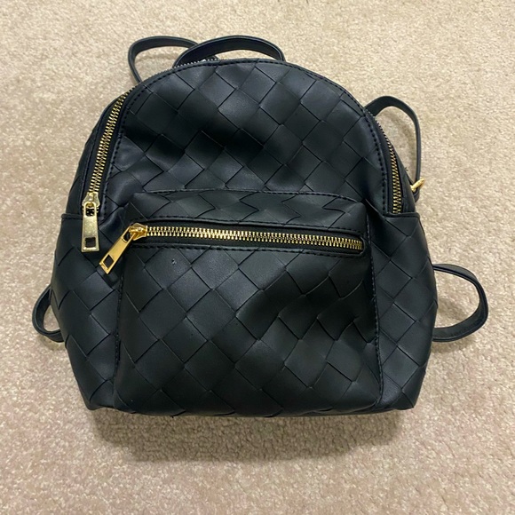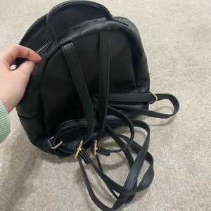 Small black backpack with gold hardware and adjustable straps. Only used once, in perfect condition