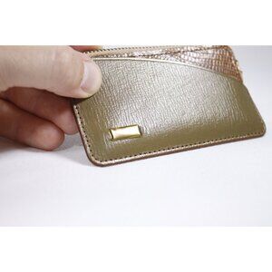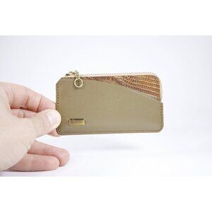 A cute leather coin wallet from Japan, new old stock, never been used ca 1960 - 1970s. The material looks to be 2 kinds of leather in a subtle beige / brown and olive green colour combination. This wallet would be perfect to keep a few bank notes, some change, or to keep your keys. It *just* about fits a bank card or business card - or you could use it for your travel card. The zipper has a short gold toned chain that (perhaps by adding an additional O ring) could be attached to your keys or bag. It has a tiny gold tone cartouche for an inscription (currently blank) and the top olive green material cuts away to the side for a little pocket.