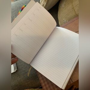 Sophisticated light tan cover, leather textured. Ideal for stylish organization. There’s a daily routine system and a note taking inside the note book. Used once and one pages torn from inside. FREE if added to a bundle of 3 items or more!