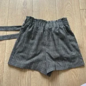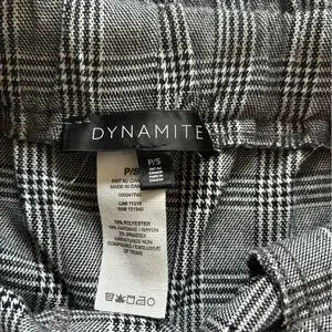 -first pair: Dynamite size small. Elastic paper bag Hugh waist with tie. Dark academia Houndstooth plaid pattern. Super comfy but too small for me. Good used condition, some pilling in the fabric but not noticeable.