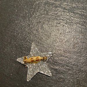Adorable brooch in the shape of a star; clear plastic with silver sparkles embedded.