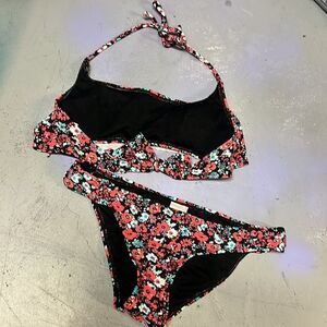 Small Black + Pink Bandeau Losan Floral Flounce Bikini