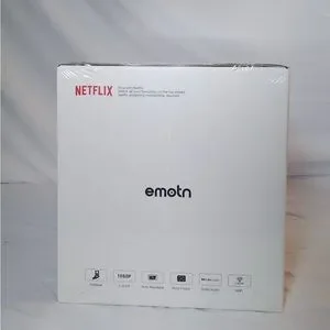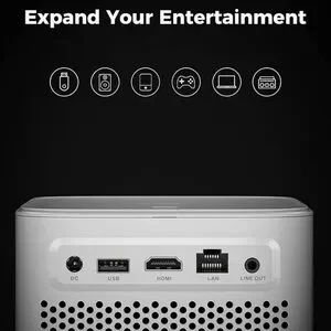 High-quality smart projector with remote control. Sleek white design. Perfect for home entertainment.