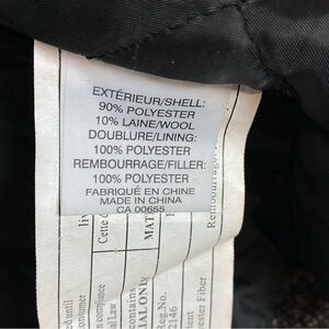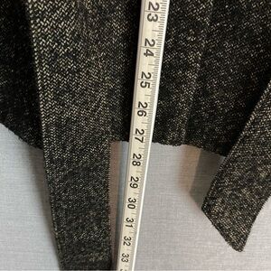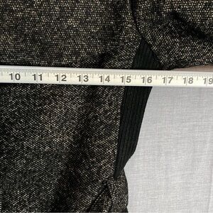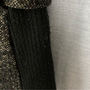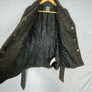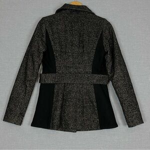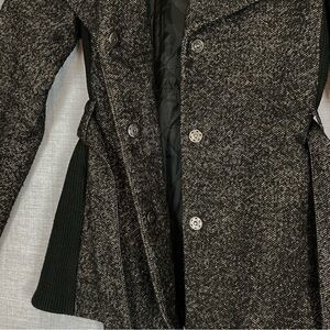 Women's tag size XS. Polyester / Wool. Rough wool feel. Black / brown heather colour. Knitted stretchy side panels. Wide belt. Fully lined. Lapels fold over and button closed (see second photo).