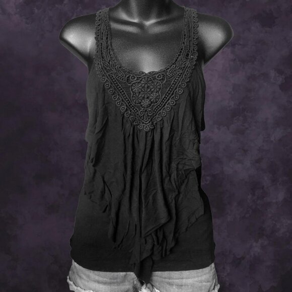 •2010s SMART SET boho festival tiered ruffle frilly drapey crochet stretchy tank top 🖤🌞🌺