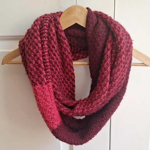 Cozy red knit infinity scarf. Perfect for chilly days.