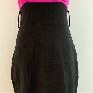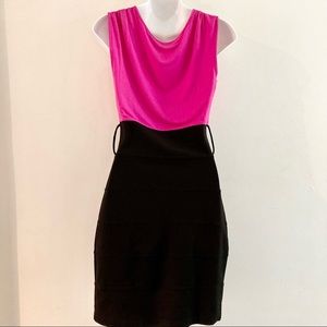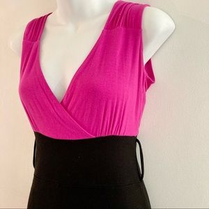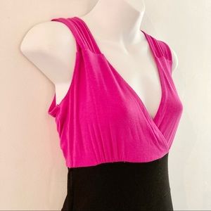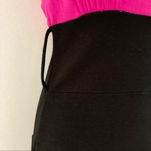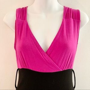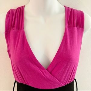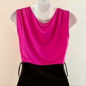 Size Medium. Fuchsia & black. Subtle Horizontal detailing on bottom half. Gently used; some overall pilling/wear. 34โ length. Rayon/spandex blend for top. Rayon/nylon/spandex bottom. Form fitting with some stretch. Large belt loops.