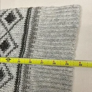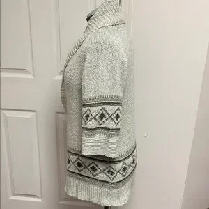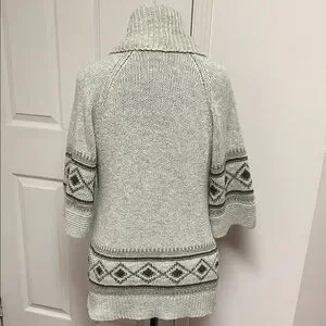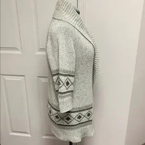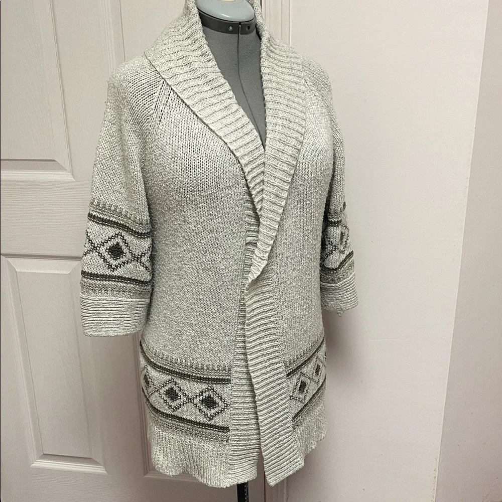 Smart Set grey cardigan with geometric patterns. Open front design. 3/4 length sleeves. Ideal for layering. In previously enjoyed condition with signs of pilling from wear. As photographed. See photos closely. Very soft and clean. Ready to add that vintage look to your next outfit.