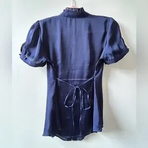 Silky navy button-front blouse with ruffle trim. Short sleeves and feminine pleated details. Tie-back and sheer.