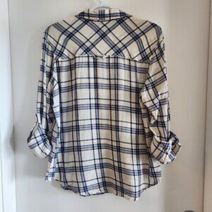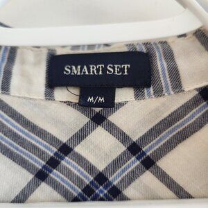 Classic plaid button-up shirt by Smart Set in blue and cream tones. Features a lightweight fabric, long sleeves with roll-tab functionality, and dual chest pockets. This size medium shirt is perfect for layering or as a stand-alone piece for casual outings.