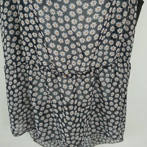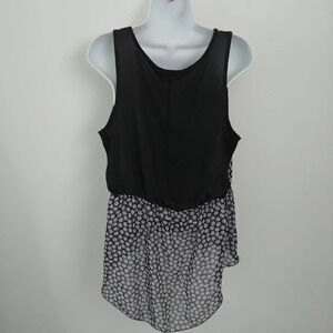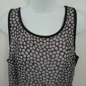 Cute black with daisy-like flower patterned high-low sleeveless blouse. Wide shoulder straps. Elastic at waist. Black attached camisole. Loose and flowy bottom. Great with a pair of leggings or slim jeans!