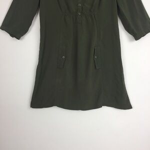 Women's size small. Hunter Green. Half button front. Under bust gathering front and back. Pocket flap accents. Roll tab sleeves - 3/4 length when unrolled.