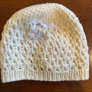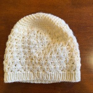White knit hat from Smart Set with pin on flower (removable, attached with a safety pin). Says one size but I’d say on the smaller end.