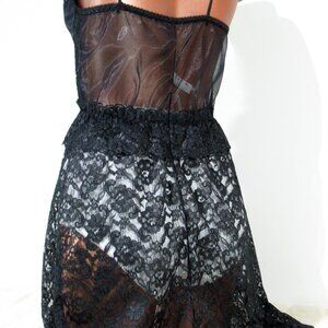 Stunning sheer femininity. A vintage nightgown made by Montreal's Smart, featuring ultra lacy and frilly front, with a hi-lo longer silky soft sheer black nylon lace skirt. Excellent vintage condition; appears NWOT. It's tagged 34, and measures 18 inches underarm to underarm with the back elastic gently stretched. Length is 44 inches from top of shoulder to lowest hem point. Note: my panties not included.