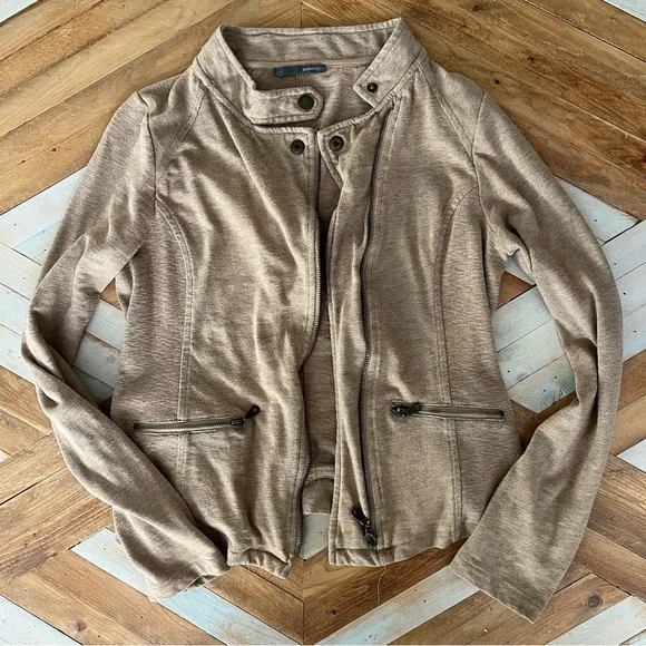 Remember SmartSet?! This jacket is a major throwback and a staple! Nice natural camel / beige colour with functional zip pockets and bronze button details. Very comfortable and easy to pair with lots of items! Fits like a standard medium (not oversized). Note this is a fabric jacket not leather or faux leather