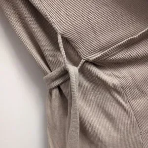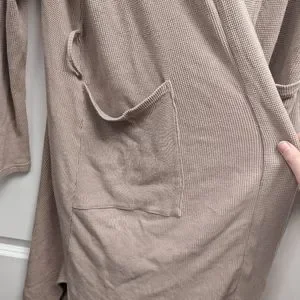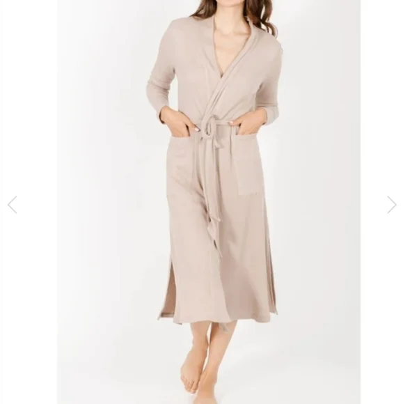 Elegant cream robe with tie waist. Long sleeves and side pockets. Perfect for lounging.