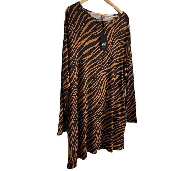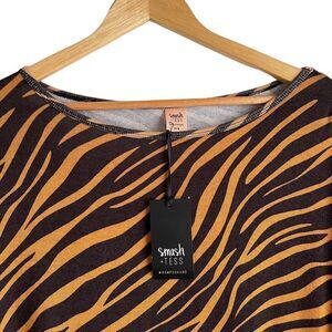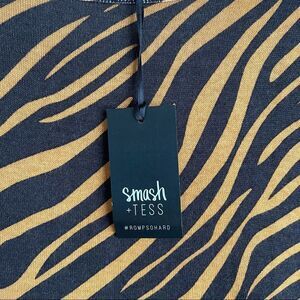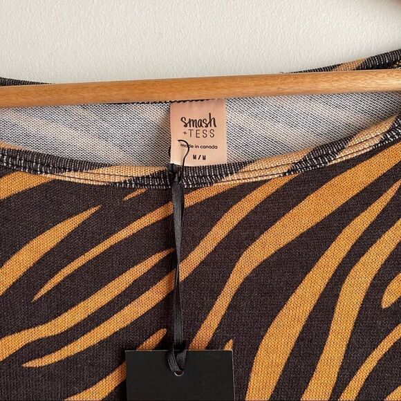 NWT and in perfect condition. Smash + Tess Sweater Weather dress in Teresa Tiger. Long sleeve with a crewneck and midi length. This dress has side pockets and is a loose fit. 65% rayon, 19% cotton, 14% modal, 2% spandex. Made in Canada. Flat lay measurements:33" length, 21" pit to pit.