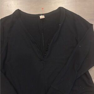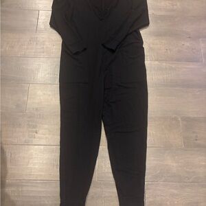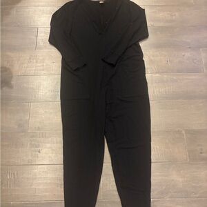 Chic black jumpsuit with a V-neckline. Features long sleeves and convenient pockets. Ideal for casual or dressy occasions.