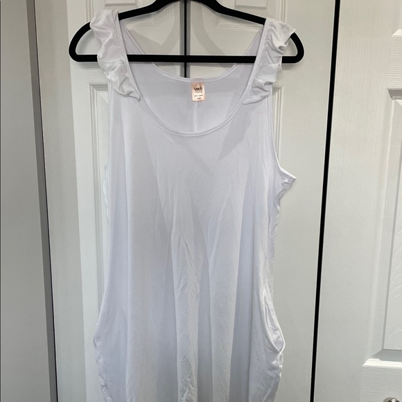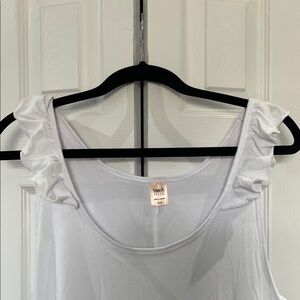 Soft white sleeveless romper with delicate ruffle shoulder details. Lightweight, breathable fabric for comfortable all-day wear.